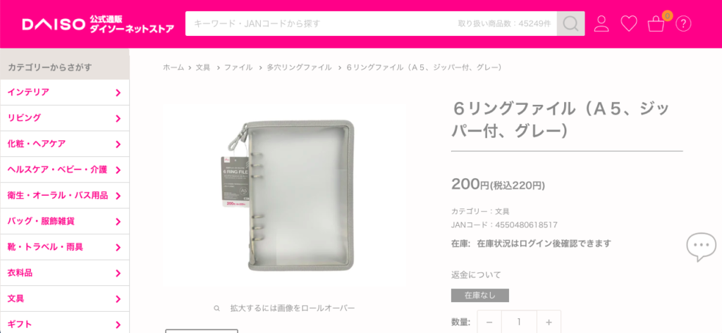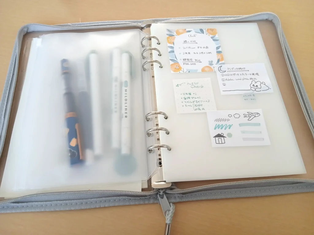 DAISOのジッパー付きの6リングファイルが最近のお気に入りで、この中に